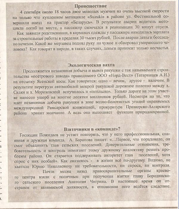 dmb2010, Спасибо за ссылку. Интересная газетка. Значит не сильно ошиблась Ядвига Львовна. Администрация - бывшая ЧК. А вот само образование газетки вызывает вопросы. Это ее первый номер? Уж больно смахивает на добивание Барановой и ее Вестей. Компромат то никакой, а ее выставляют некрасиво. Понятно все читатели вестей перейдут сюда. И кирдык Вестям. Многое говорит за это. Если это так, то ход умный.